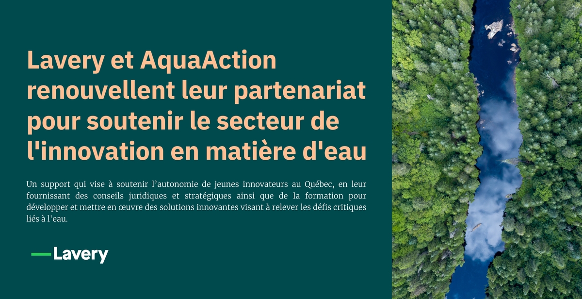 Lavery is pleased to announce that it is renewing its partnership with AquaAction, which aims to support and strengthen innovation initiatives in the water industry.