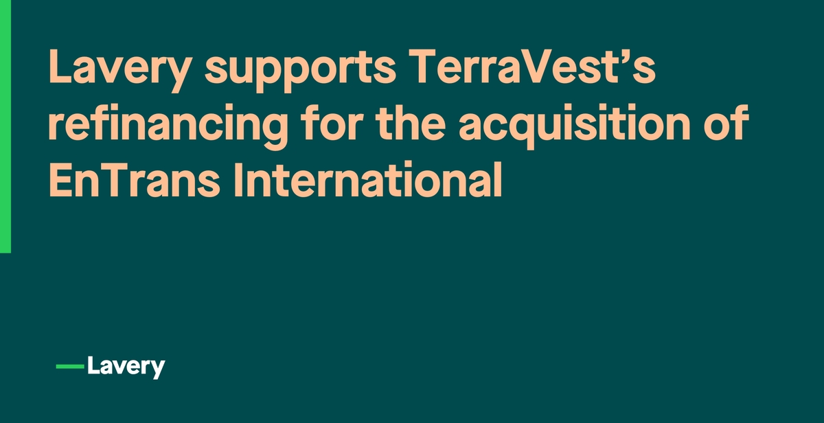 Lavery played a key tole in advising TerraVest on the financing aspects of this transaction. The team at Lavery, headed by Brigitte Gauthier, including Bernard Trang, Francis Sabourin, Annie Groleau, Ana Cristina Nascimento, Jessy Ménard, Arielle Supino and Yanick Vlasak, worked closely with TerraVest to structure the amended credit facility. Lavery’s involvement allowed TerraVest to secure the funds needed to acquire EnTrans International, thereby reinforcing its position on the North American market.