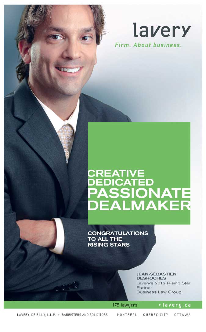 Lavery is pleased to announce that Mr. Jean-Sébastien Desroches, a business law partner at the firm, has received the Rising Star Award, given out by the Legal Lexpert Directory, during a gala that was held in Toronto on December 3, 2012. This Canada-wide contest pays tribute to lawyers under 40 who are considered rising stars in the legal profession in Canada. The winners are selected based on rigorous and well-delineated criteria: professional accomplishments, leadership, contribution to firm profitability, business acumen, vision, education and awards, and teamwork.