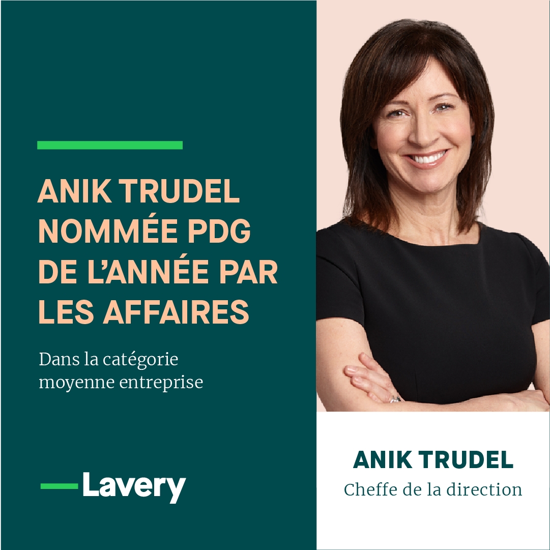 Lavery est fier d’annoncer que sa cheffe de la direction, Anik Trudel, s’est vu décerner la distinction de PDG de l’année 2023, dans la catégorie moyenne entreprise, par le Journal Les Affaires. La nomination d’une femme dans cette catégorie est une première dans l’histoire de Les Affaires.