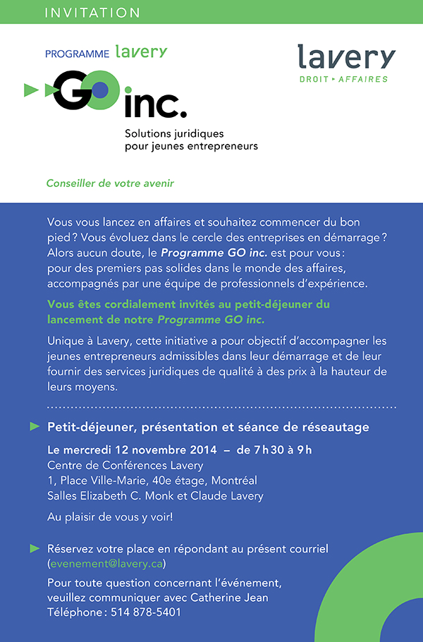 Lavery est heureux d’annoncer la création du Programme GO inc. qui a pour objectif de fournir aux entreprises en démarrage admissibles, divers services juridiques de qualité à prix très concurrentiel. Le petit-déjeuner de lancement aura lieu le mercredi 12 novembre de 7 h 30 à 9 h 00, à notre centre de conférences de Montréal. Plus de détails ci-dessous et sur notre page Démarrage d'entreprise - Programme GO inc.