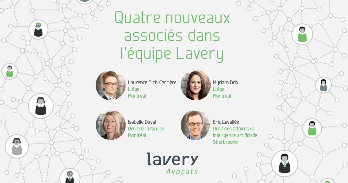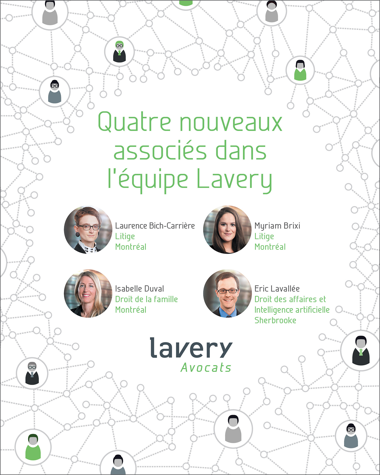 Lavery est heureux d’annoncer les nominations de Laurence Bich-Carrière, Myriam Brixi, Isabelle Duval et Eric Lavallée comme associés du cabinet.