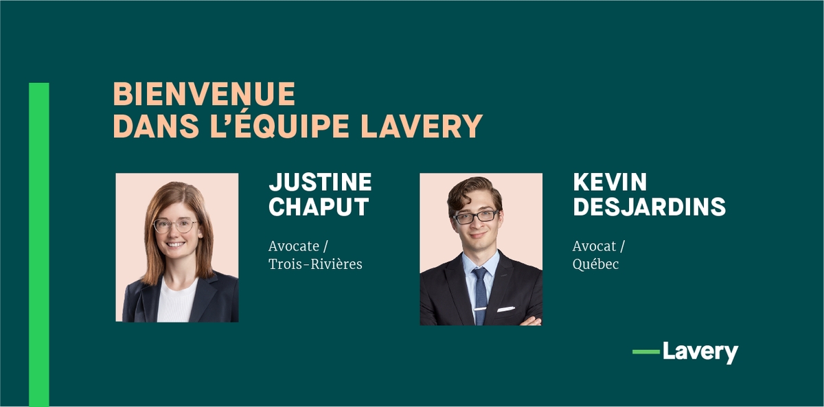Lavery est heureux d’accueillir deux nouveaux membres au sein du bureau de Trois-Rivières et Québec : Justine Chaput et Kevin Desjardins.