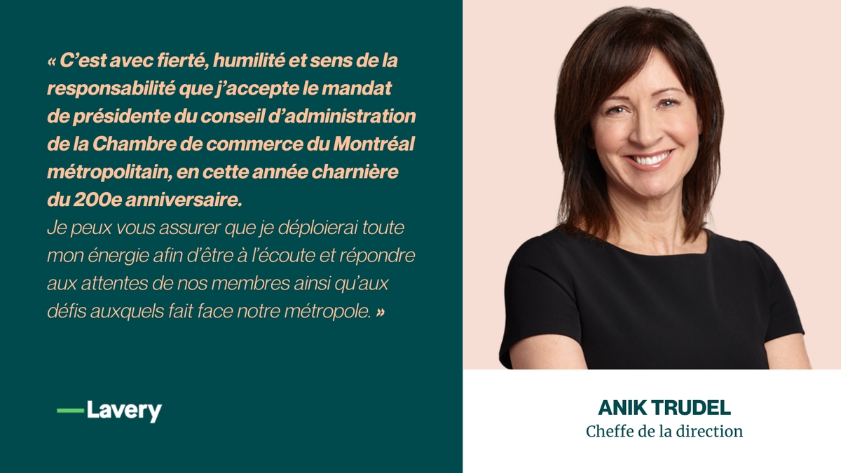 Notre cheffe de la direction est engagée auprès de la CCMM depuis 2018. Sa nomination à titre de présidente du conseil s’arrime à la vision ainsi qu’au positionnement de Lavery qui est voué au développement économique de la grande région métropolitaine et de celle du Québec, en accompagnant la croissance de nos PME ainsi que celles des plus grandes entreprises et institutions qui font affaire au Québec.