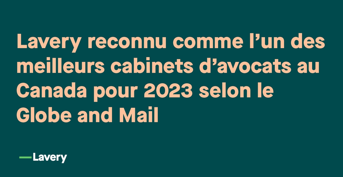 Le 15 novembre 2022, le Globe and Mail dévoilait les résultats de son édition inaugurale du classement Canada’s Best Law Firm pour l’année 2023 et nous sommes heureux d’annoncer que Lavery y figurait.