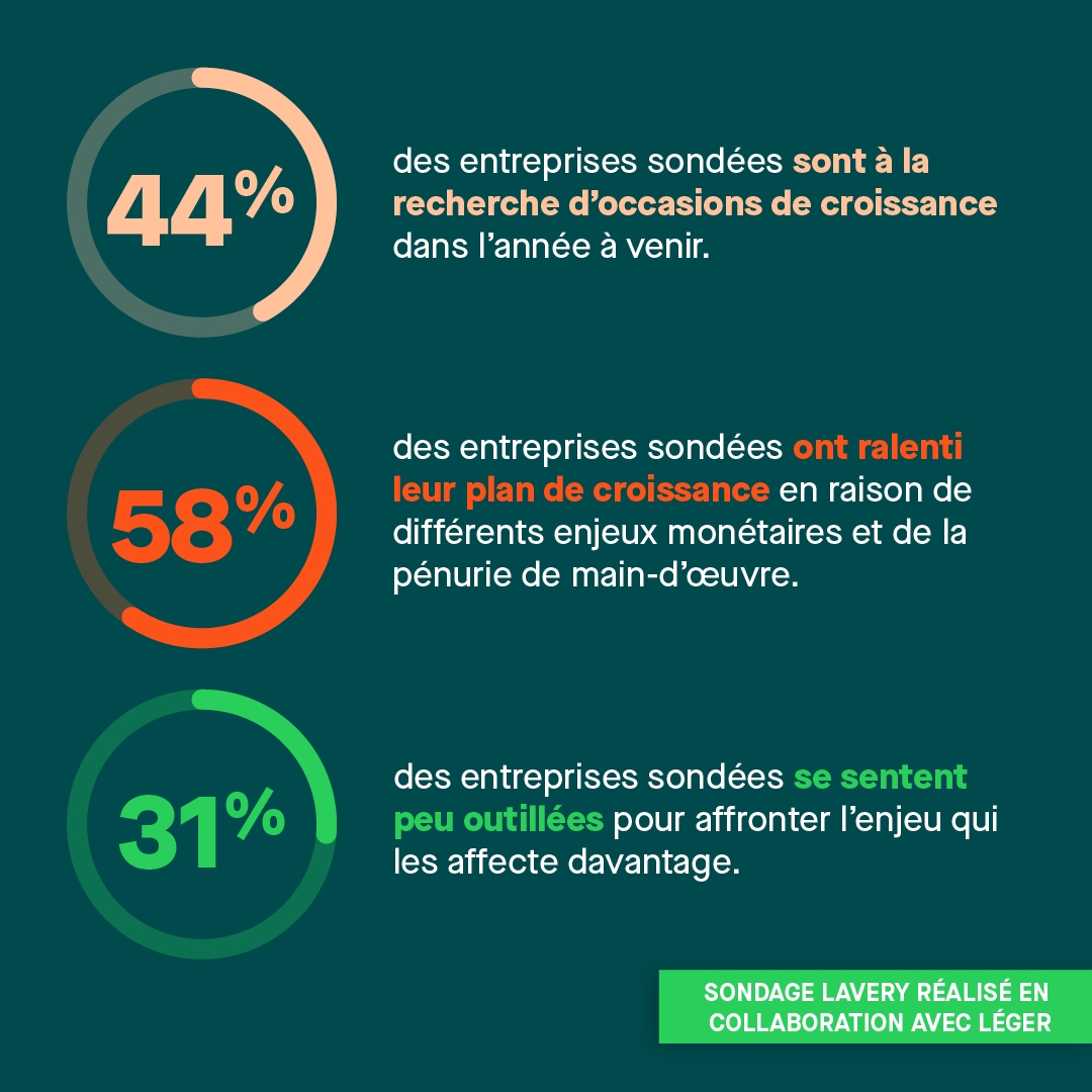 Un sondage réalisé par le cabinet d’avocats Lavery en collaboration avec Léger révèle que plus de la moitié des entreprises du Québec (58 %) ont ralenti leur plan de croissance en raison de différents enjeux monétaires et de la pénurie de main-d’œuvre. Ce sondage, qui prend le pouls des entreprises québécoises quant à leurs priorités et perspectives de croissance, révèle néanmoins que près de la moitié des organisations (44 %) sont toujours à la recherche d’occasions de croître dans l’année à venir.
