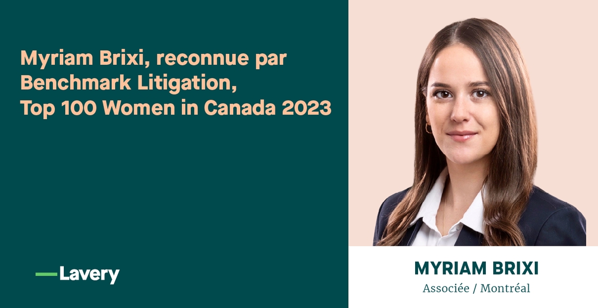 Lavery est heureux d'annoncer que Myriam Brixi a été reconnue dans la 10e édition du Benchmark Litigation, Top 100 Women in Canada 2023.